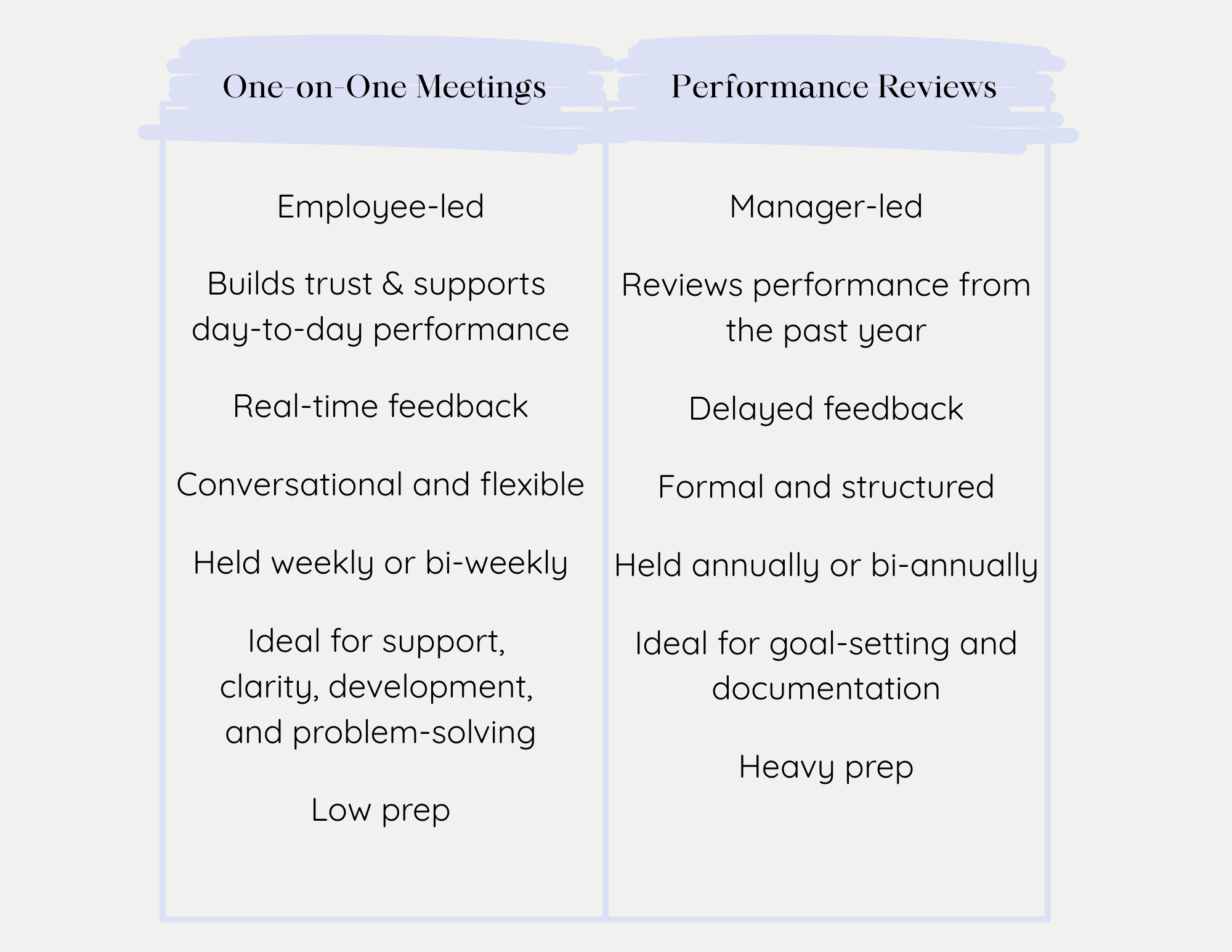 👉 Regular one-on-one meetings will always have a bigger impact on performance, growth, and employee engagement than any annual performance review ever will.